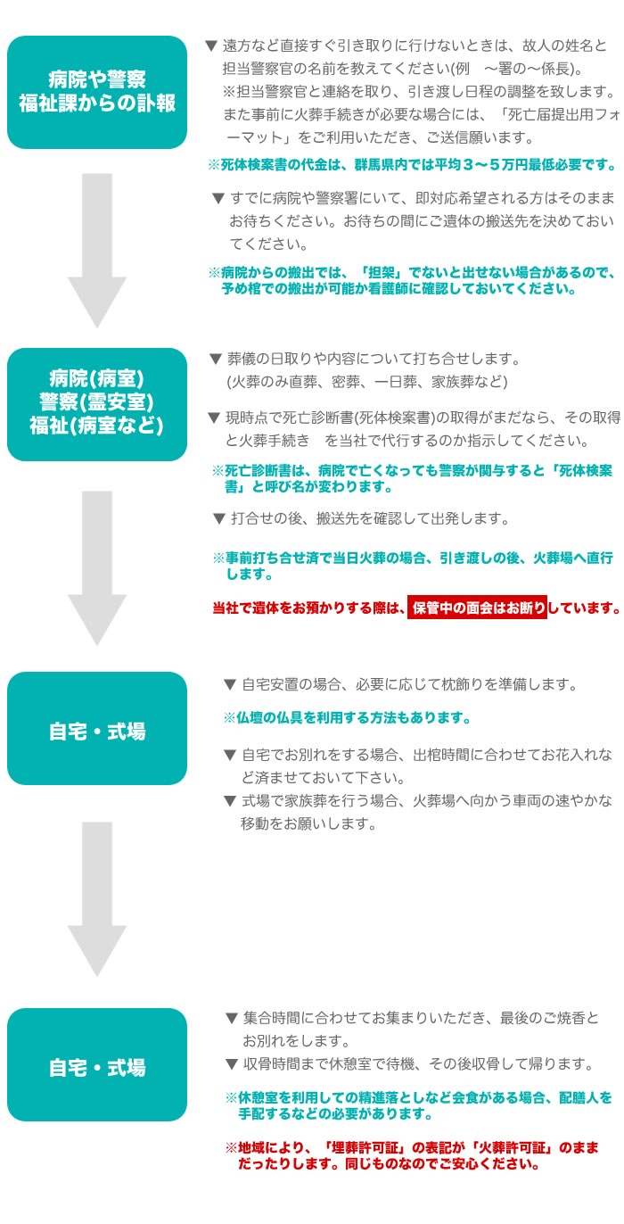 遺体を直葬儀(家族葬)で行いたいとき、当社での手順は次のとおりです。